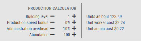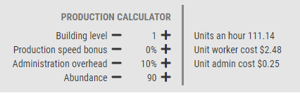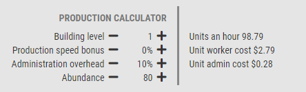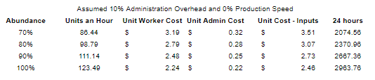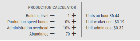 As seguintes imagens mostrarão um aumento na abundância de 70%, 80%, 90% e 100%. Observe a relação entre Quantidade, Custos Unitários de Trabalhador e Custos Unitários Administrativos. Cada um assumiu 0% de Bônus de Velocidade de Produção e 10% de Sobrecarga Administrativa.