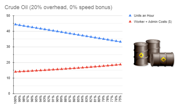 O gráfico abaixo mostra a queda tanto na abundância quanto na quantidade, enquanto os salários (custo unitário de trabalhador + custo unitário administrativo) aumentam (plataforma de petróleo de nível 1).