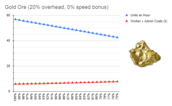 O gráfico abaixo mostra a queda tanto na abundância quanto na quantidade, enquanto os salários (custo unitário de trabalhador + custo unitário administrativo) aumentam (mina de nível 1).
