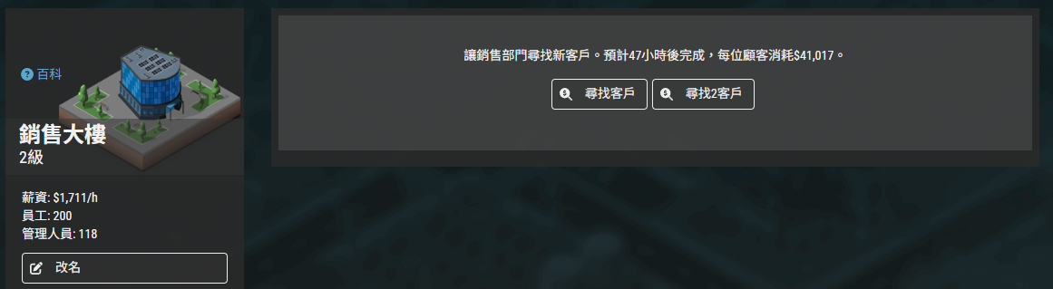 大樓裡的員工會尋找客戶,47小時會提出一個訂單,你可以選擇交付或拒絕。銷售大樓建築的每一層(等級)都可以尋找一個訂單。一間2級銷售大樓可以同時尋找2個訂單。一間3級銷售大樓可以同時尋找3個訂單等。
