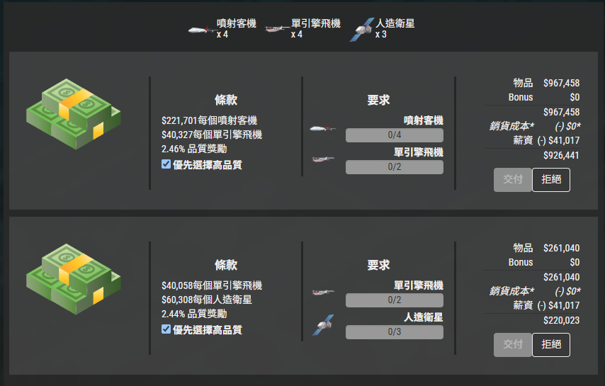 訂單條款會有所不同,但是客戶總是會要求少量的1或2種航空航天終端產品。沒有任何品質要求,但根據條款裡的品質獎勵,交付更高品質的產品將讓你賺更多錢。銷售速度將降低你的尋找成本。如果要賺錢,交付的產品的採購成本應該比條款價錢低。尋找成本已經包括在利潤中。