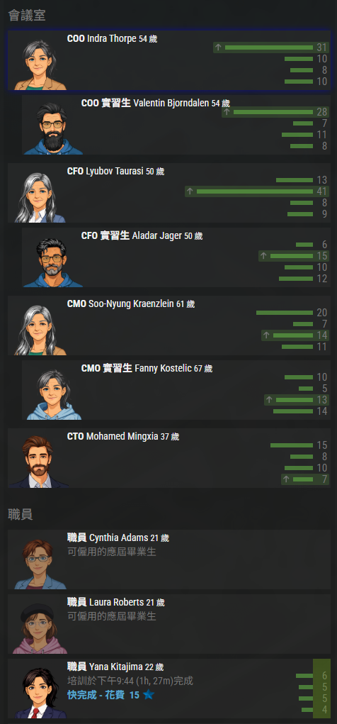 提示: 你可以透過「各領域課程」來探索新高管的天賦。如果他們在 2 到 4 次培訓內未獲得任何技能點,建議立即解雇並尋找新的候選人。