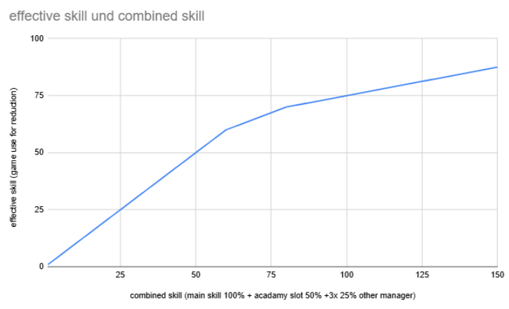 Poznámka: osa Y zobrazuje efektivní dovednostní body pro výpočet redukce a osa X poté kombinovanou dovednost (primární dovednost 100 % + slot akademie 50 % + 3 * 25 % ostatní vedoucí)