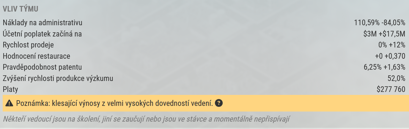 Poznámka: Je důrazně doporučeno, abyste rozuměli nákladům spojeným s najímáním vedoucích. To, že můžete najmout vedoucí ještě neznamená, že byste je najmout měli. (Většina hráčů čeká až se dostanou na 20% náklady na administrativu než najmou vedoucího.)