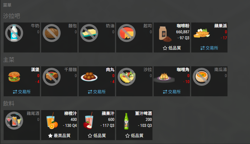 每種食物類別中至少要有一道菜。每道菜對你的評級有不同的影響,主要取決於其成本。如果你提供各種菜,你也會得到一個評級獎勵。一個類別的菜越多,每種菜的消耗量就越少。